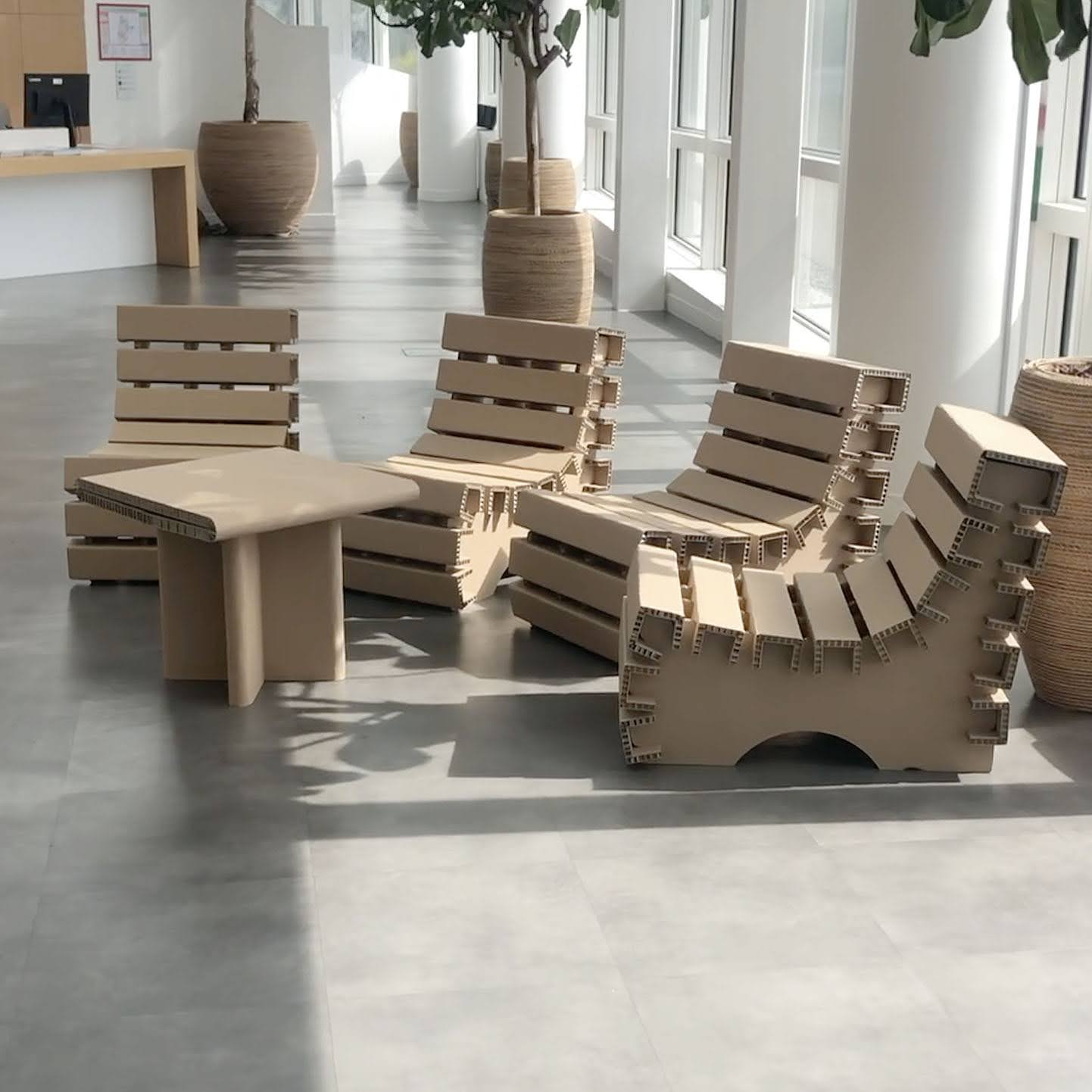 Concernant le mobilier en carton, le choix a été rapide grâce à notre large gamme de produits ! Le fauteuil en carton qui reprend le design des années 70 a marqué les esprits, sa sélection s’est faite naturellement.
