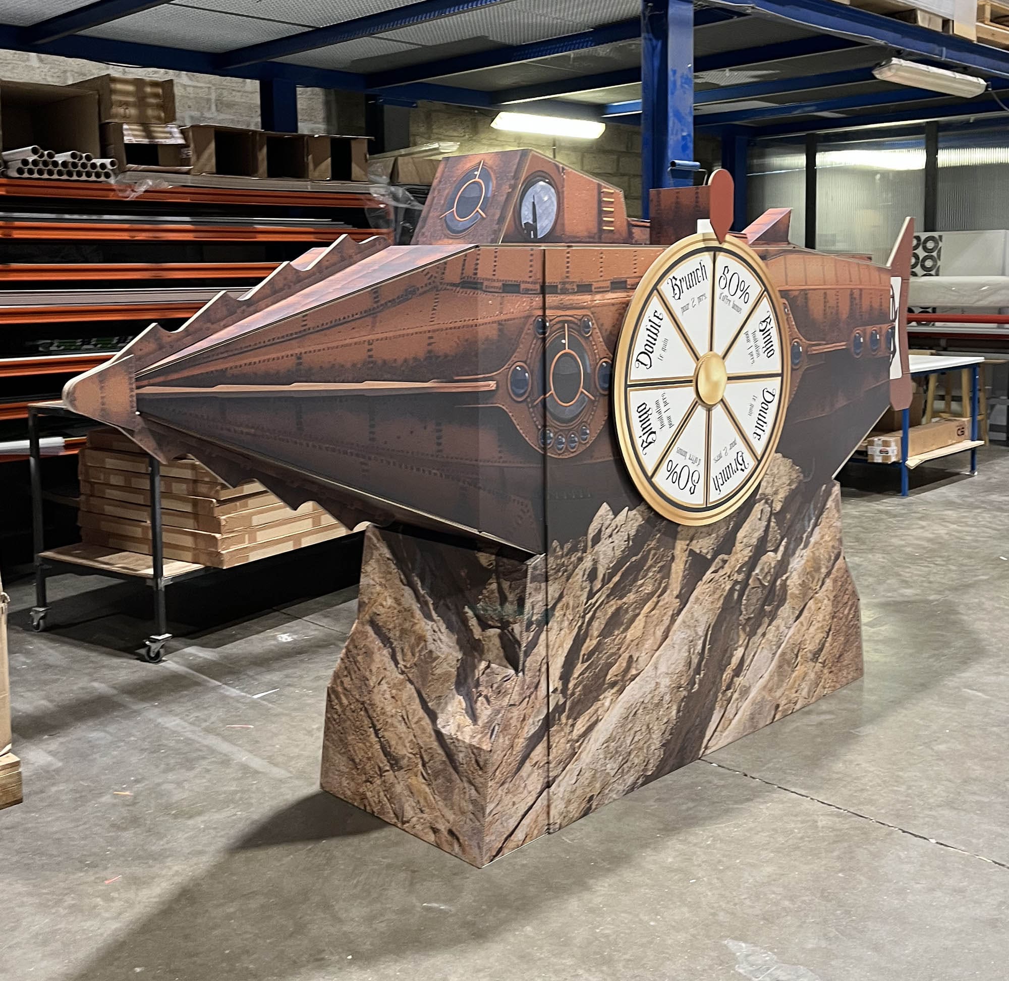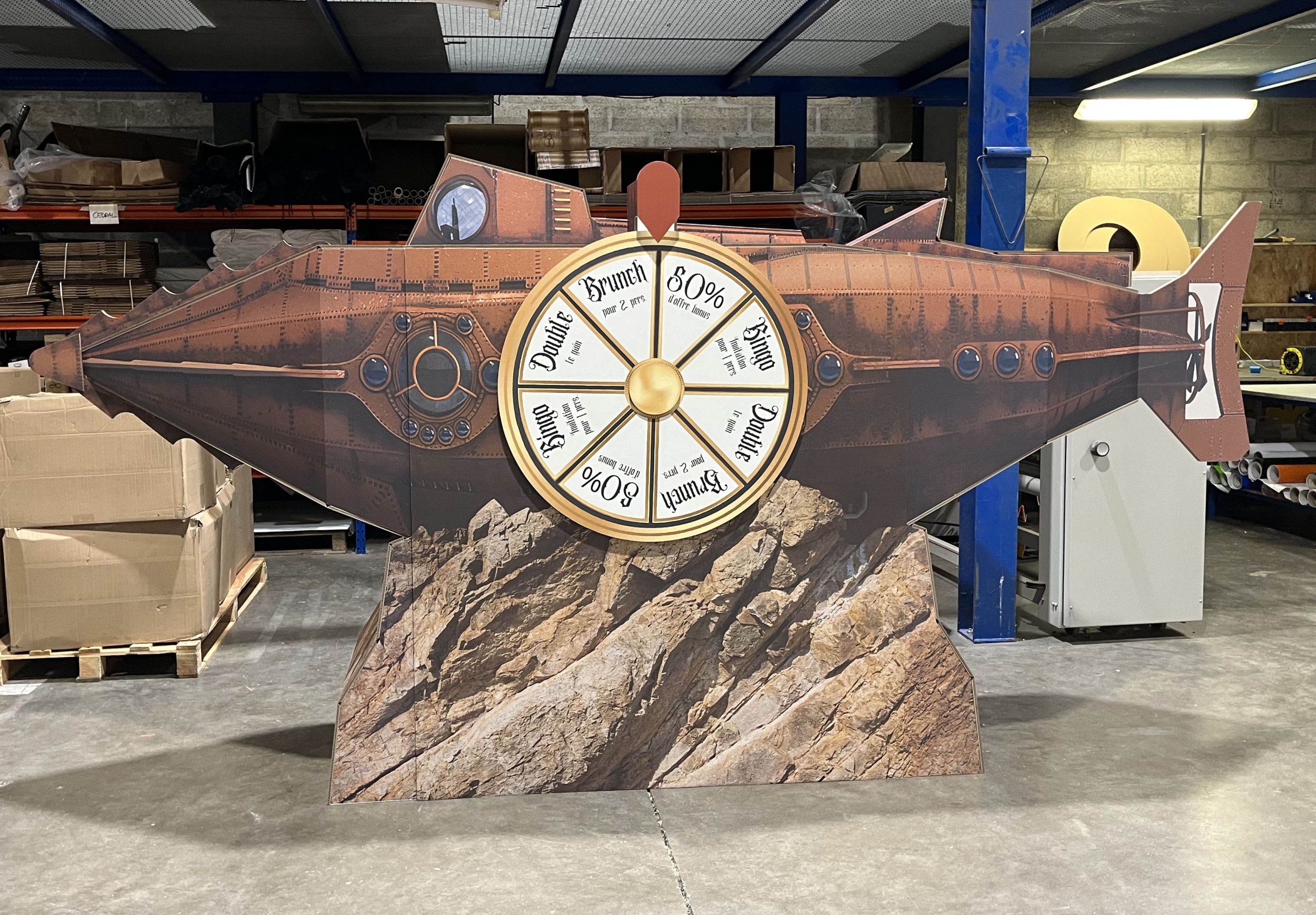 Une illustration parfaite de la créativité et du potentiel des décors événementiels : Le Nautilus, une structure en carton grandeur nature conçue pour un casino. Ce concept sur mesure intègre une roue de la fortune, apportant une touche de divertissement et de suspense qui captive instantanément les clients lors de l’événement.