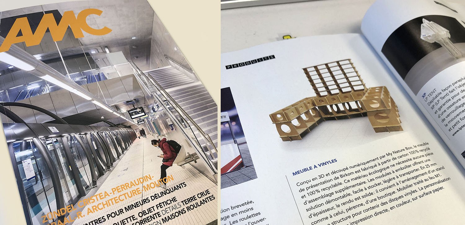 AMC Archi est réputé pour sa ligne éditoriale haut de gamme sur l’architecture. Dans le numéro de Février, un article complet sur le nouveau mobilier et les solutions écologiques. La revue nous a contacté afin de présenter nos solutions de meuble en carton sur mesure. Ainsi l’article d’AMC commente la réalisation que nous avons effectuée l’année dernière pour une boutique de disques vinyle. Des bacs sur mesure en carton 100% recyclé et fabriqué en France Nous avons fait toute la conception en 3D, fabriqués les meuble dans notre atelier et gérer l’installation. Une boutique étant forcément un ERP, un carton spécialement traité M1. Le classement au feu qui est dans ce cas indispensable. My Nature Box a fait un véritable travail d’agenceur pour cette boutique.