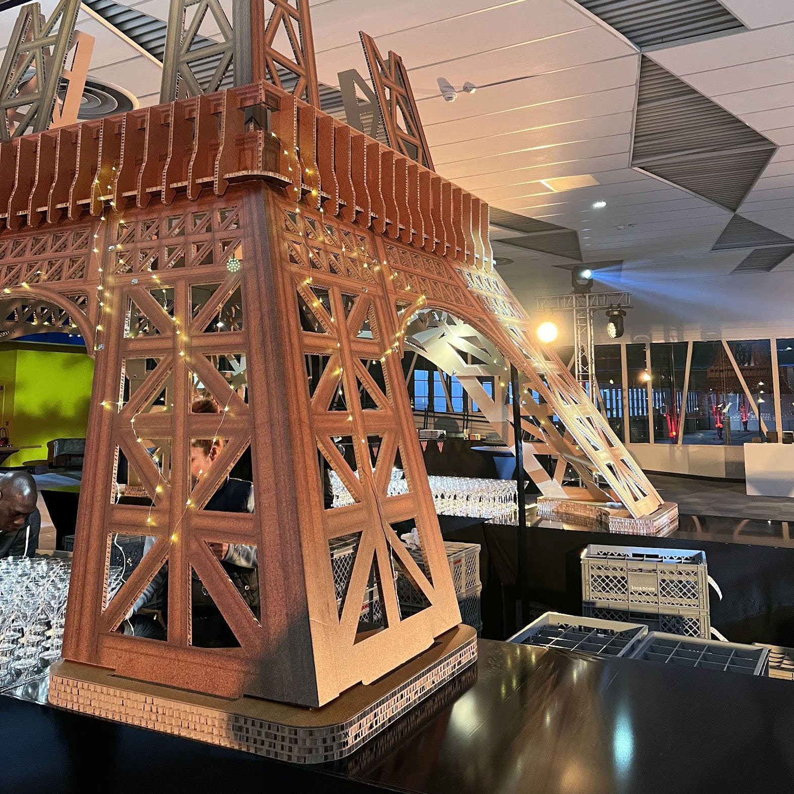 Tour Eiffel en carton géante, construction du premier étage pour être posé sur des bars.