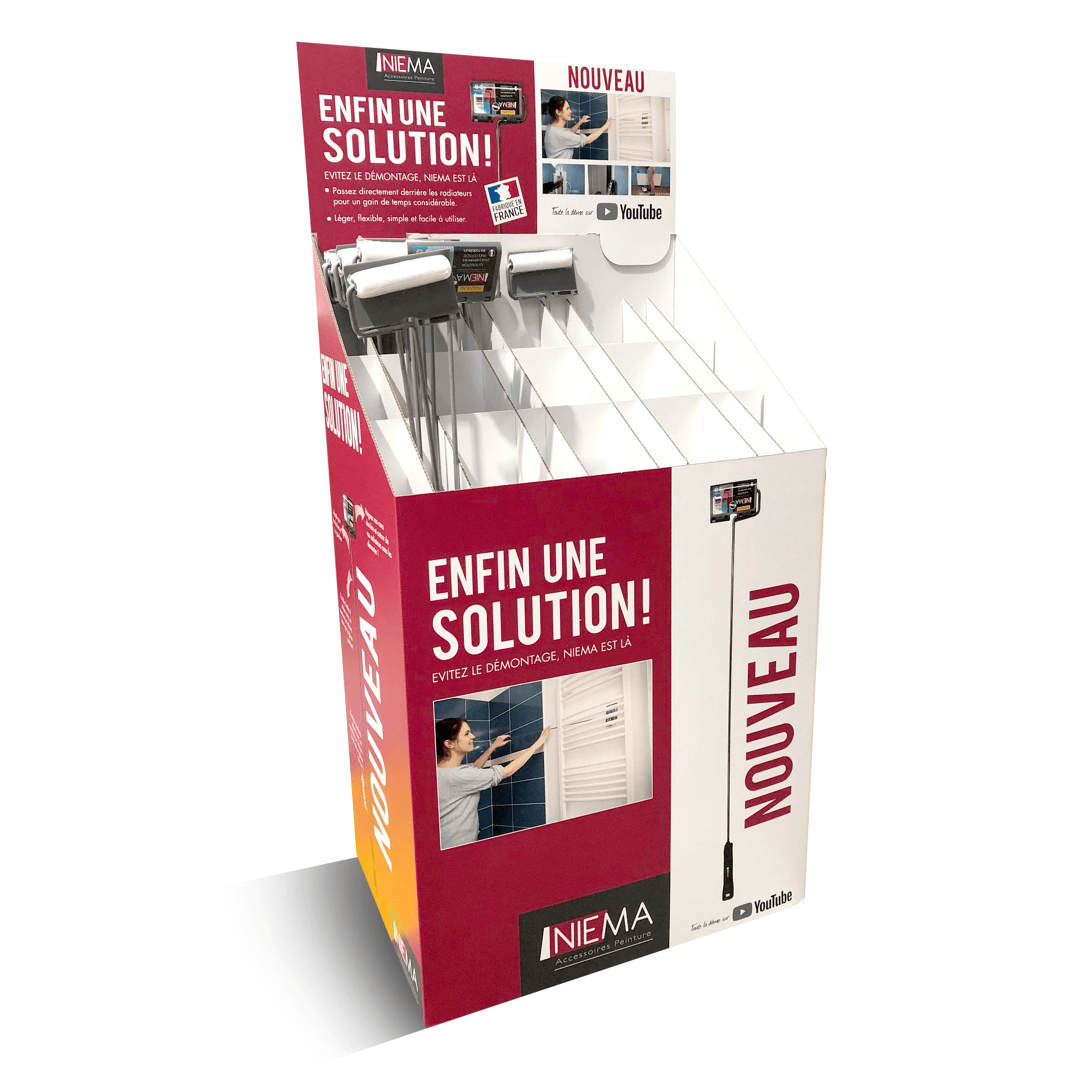 Livrez vos distributeurs directement avec vos produits dans cette PLV de sol : un box palette display. Il est spécialement formaté pour le 1/4 de palette. Dès lors, le box palette se monte en atelier et est garni directement avec les produits. Le tout se recouvre d’une coiffe en carton et est posé ensuite sur une palette. Ainsi, le distributeur installe le box en magasin et enlève simplement la coiffe. Les produits sont tout de suite disponibles à la vente. Un stock tampon de vos produits permet au distributeur de recharger la PLV.