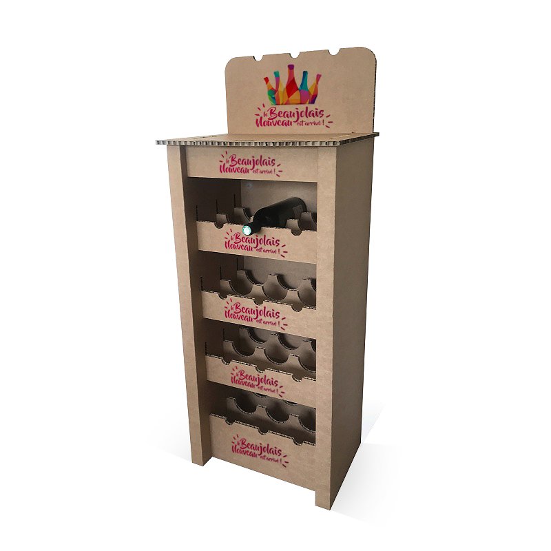 Comment exposer vos produits quand ils ont une forte masse ? My Nature Box a la solution grâce au carton alvéolaire recyclé. Un présentoir solide, mais en carton. C’est très malin : écologique et néanmoins économique. De plus, il confère une grande solidité à votre PLV présentoir. My Nature Box crée un prototype à partir de votre cahier des charges et réalise une maquette en blanc. MNBOX vous propose ici une PLV en carton pour présenter votre gamme de bouteilles de vin, au autre. L’aspect de cette PLV confère un rendu très original et naturel. Elle est idéale pour présenter une gamme de produits BIO. Le carton est issu du recyclage à 100% et est fabriqué en France.
