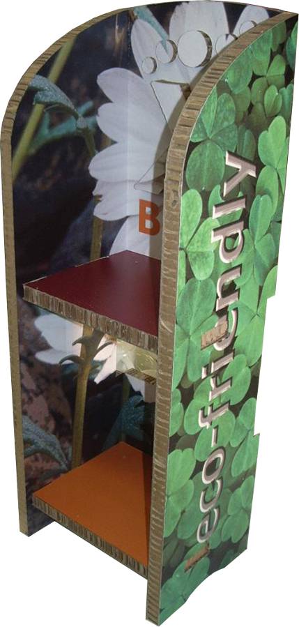 PLV avec impression total sur carton de 16 mm d’épaisseur. Cette plv est un display de comptoir, facile à monter et à transporter.