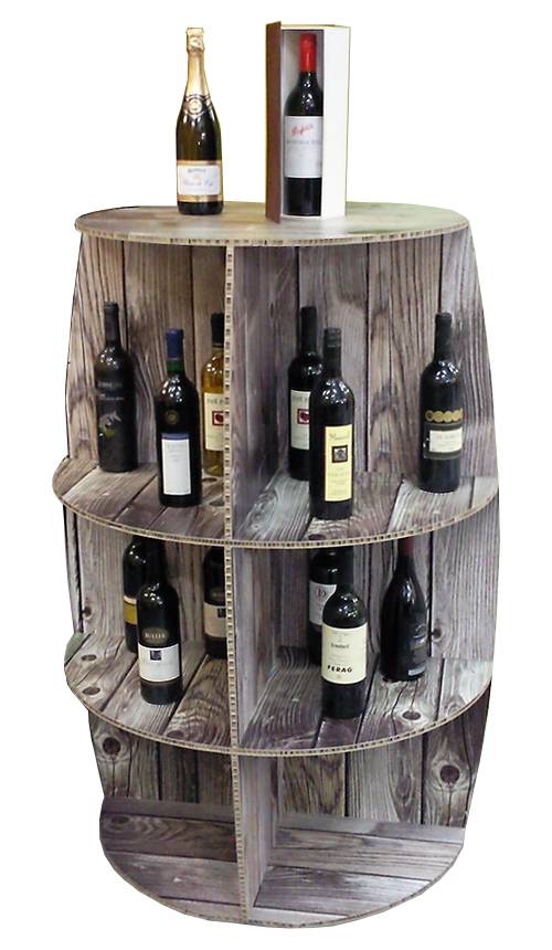 Le mobilier présenté ici sous forme de tonneau est personnalisable : visuel de fond, logo, plateau. Ce présentoir en carton peut également servir de mange debout ou de stand dégustation.