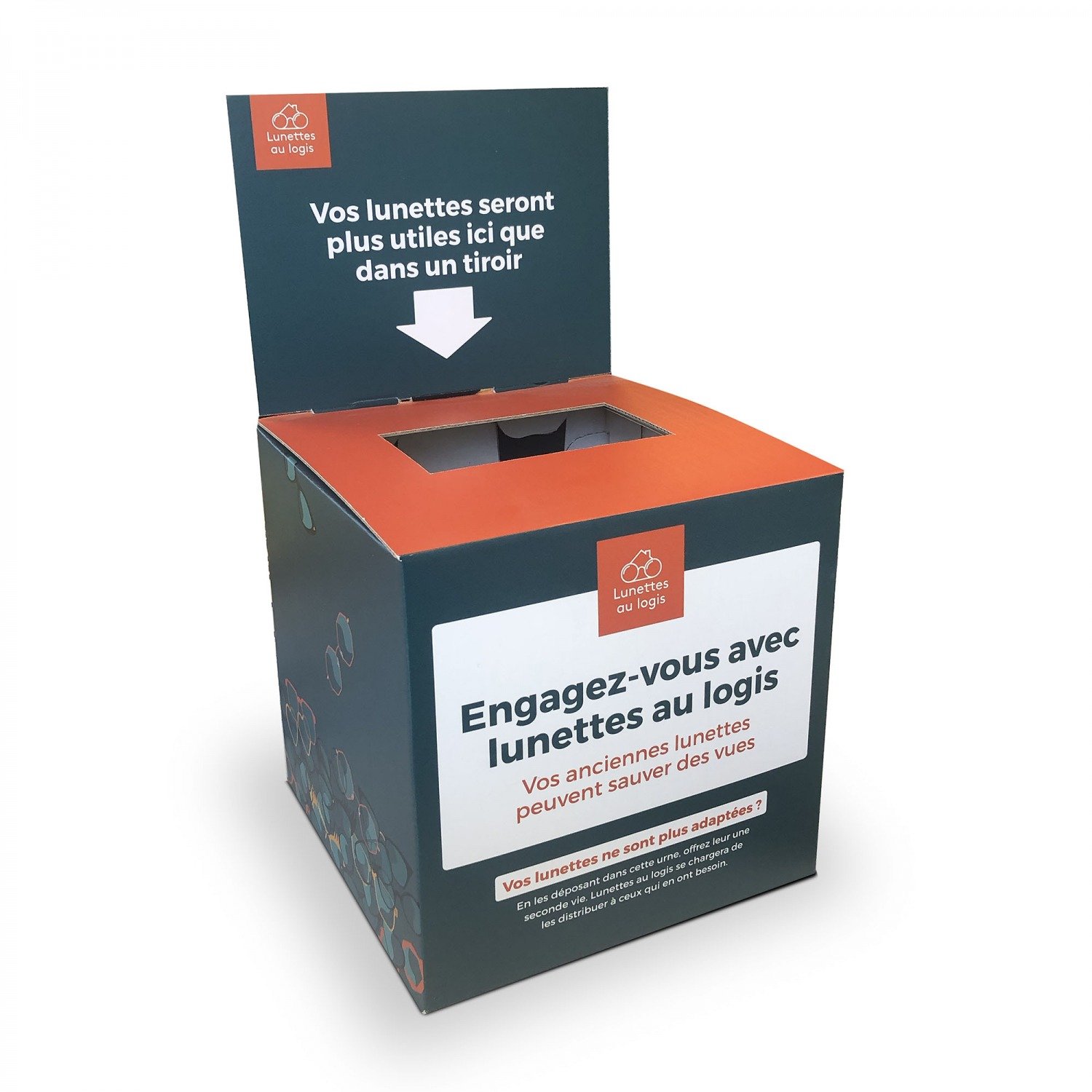 Facile à monter et visible dans votre réseaux de boutique, l’urne à lunette permet de proposer à vos client la collecte d’ancienne paires de lunettes.