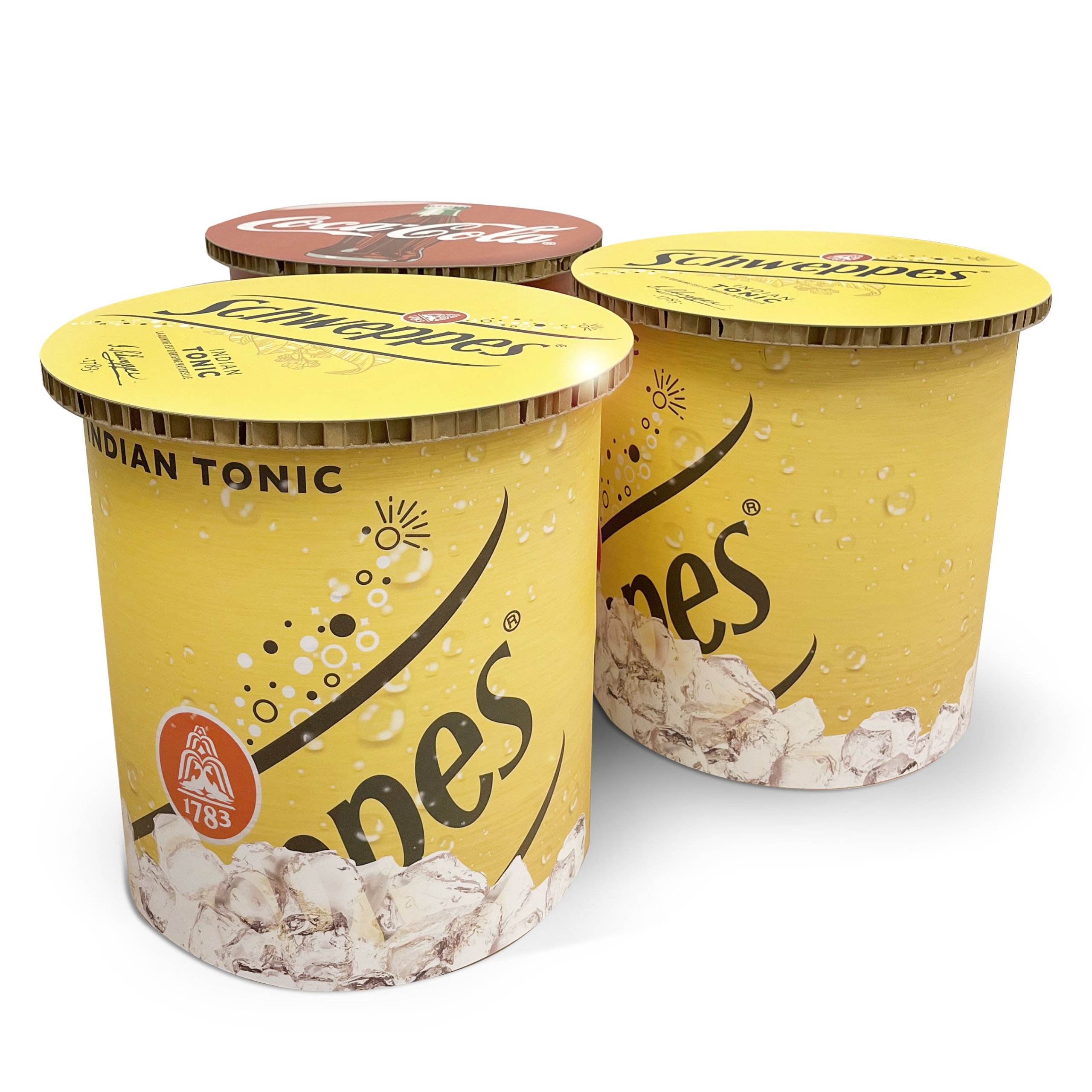 Le pouf 100% personnalisable pour vos évènements. Il est fabriqué en carton 100% recyclé d’une épaisseur de 16 mm, la personnalisation se fait sur une carte 380 gr.
